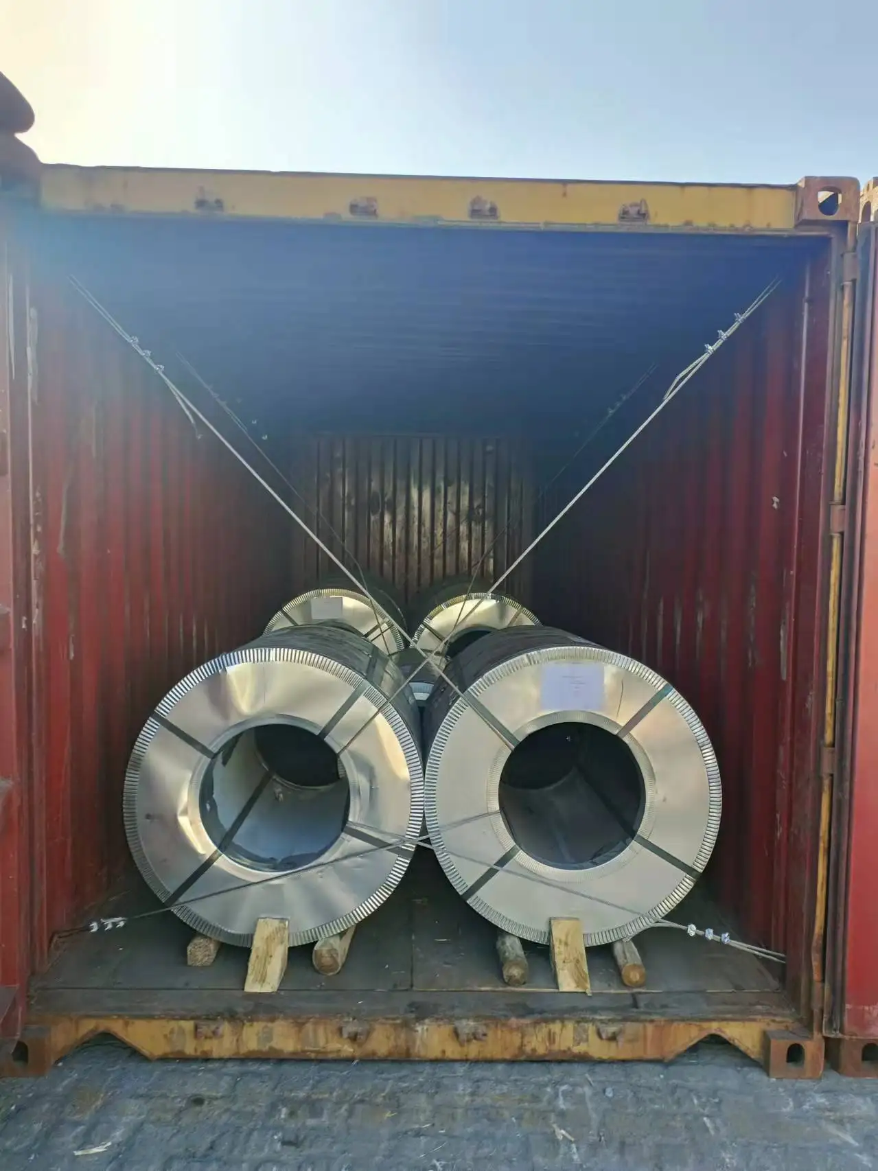 Wood tray and triangle wood are used to fix the coil, and the two sides are fixed with steel wire rope to effectively prevent the